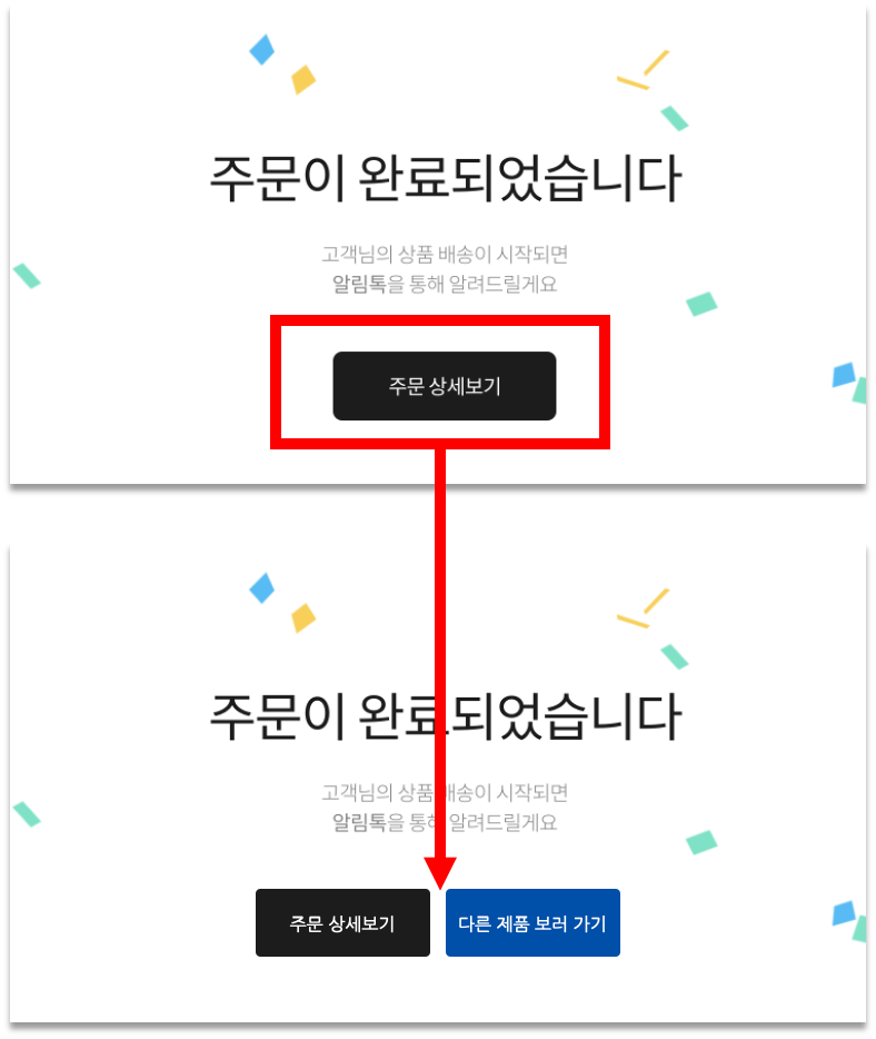메인 카피: 주문이 완료되었습니다. / 서브 카피: 고객님의 상품 배송이 시작되면 알림톡을 통해 알려드릴게요. / CTA버튼: 주문 상세보기