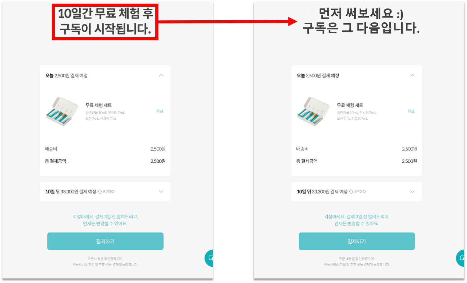여기서 측정해야 하는 핵심 지표(KPI)는 결국 결제 페이지의 전환율을 높여 '체험세트 구매완료'까지 한 구매자의 비율이다. 따라서, 단순히 4단계 '결제하기' 버튼만 누르게 유도하는 게 아닌, '자동 구독'에 대한 경계를 무너뜨릴 필요가 있다. 그래서 B그룹(실험군)에게 노출할 페이지 상단 메인카피는 '체험해보세요'를 강조하고, 하단 서브카피에는 언제든지 '구독 취소'할 수 있고, 결제하기 전 미리 알림을 보낸다는 메시지를 강조할 필요가 있다.