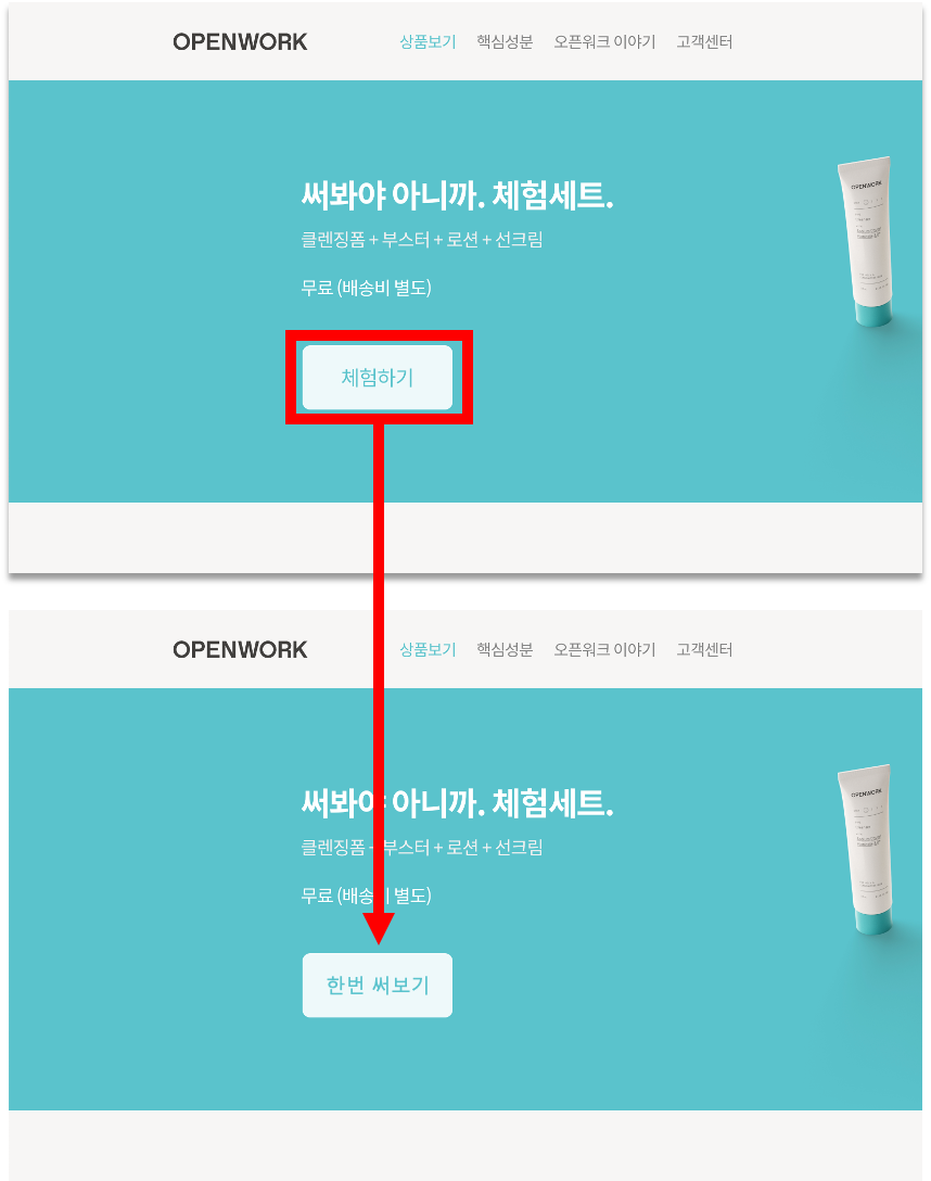 오픈워크의 사용자 평점은 4.6으로 높은 편이다. 제품에 자신 있고, 단품 구매자보다 장기 구독자가 메인 타겟인 서비스라 많은 고객을 '체험'해보게 하고, 그들을 장기 구독자로 만드는 게 중요하다. 위 쪽 이미지를 보면 '체험하기'를 유도하는 페이지다. "써봐야 아니까. 체험세트"라는 카피가 메인으로 적혀있고, 그 하단에는 구성품과 무료배송임을 알리는 서브카피가 적혀있다. 그리고 '체험하기' CTA버튼을 통해 소비자의 체험을 유도한다. 앞서 말했지만, 스킨케어 제품은 다른 사람 후기가 아무리 좋아도, 내 피부에 안 맞는 것을 쓰는 것은 안 쓰는 것보다 못하니까 항상 고민하게 된다. 그러다 보니, 나와 피부 타입이 최대한 비슷한 사람의 후기를 찾느라 많은 시간을 보낸다. 이런 낭비되는 시간을 줄이고, 본인에게 맞는지 확인할 수 있게 '체험세트'를 제공하는 것은 소비자 입장에서 긍정적인 경험을 할 수 있게 한다. 다만 조금 아쉬운 건, CTA버튼 카피다. 아무래도 메인카피와 조금 더 연관되게 작성했으면 어땠을까 생각이 든다. 가령, '한번 써보기'와 같은..? 대화를 주고받는 느낌의 카피.