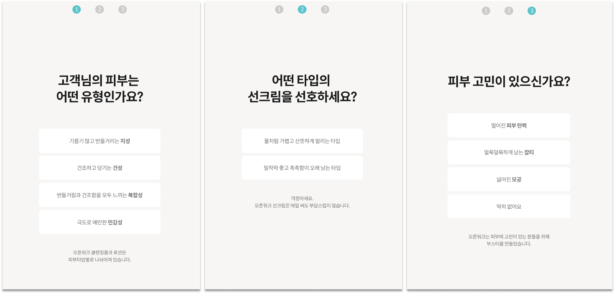 오픈워크의 장점 중 하나는 본인의 피부 타입에 맞는 제품을 선택해서 사용할 수 있다는 점이다. 본인의 피부가 지성인지, 건성인지 / 산뜻하게 발리는 타입을 선호하는지 촉촉함을 선호하는지 등 3가지 질문에 대한 답을 하면, 선호에 맞게 제품이 리스트업 된다. 번들거림과 촉촉함을 넘어 쩍 달라붙는 느낌을 싫어하는 나 같은 사람에게는 딱 맞는 프로덕트라 생각했다. 첫 번째 질문은 '고객님의 피부는 어떤 유형인가요?'인데, [지성, 건성, 복합성, 민감성]을 선택할 수 있다. 그다음은 선호하는 타입의 선크림을 고를 수 있고, 피부에 영향을 공급할 수 있는 부스터도 선택할 수 있다. 선택 과정에서 불편한 점은 없었다. 선택지도 적당했고, 페이지 하단에 혹시나 생길 수 있는 걱정에 미리 답을 해줘서 고민을 덜 수 있었다.