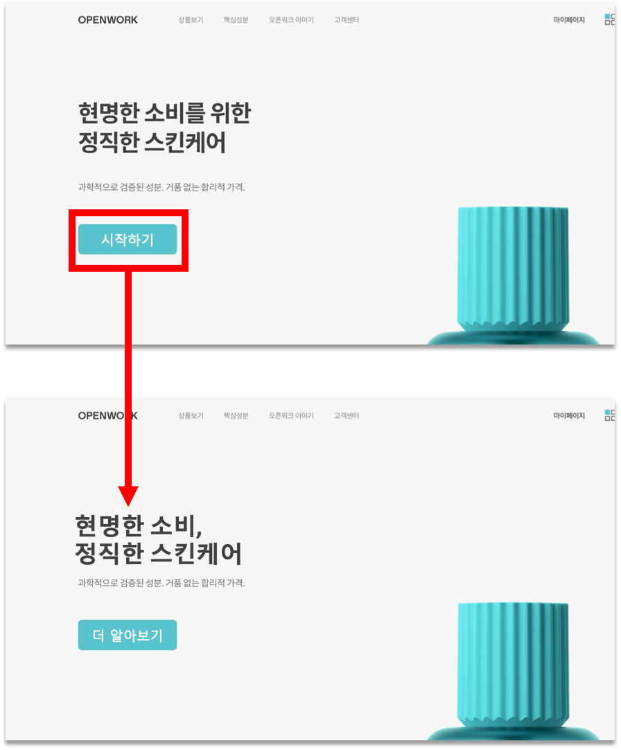 위쪽 이미지는 현재 오픈워크 홈페이지 사진이다. 합리적으로 제품을 판매하는 오픈워크답게 '현명한 소비' 키워드를 가장 크게 강조했다. 근데 현명한 소비라는 말은 알겠는데, 현명한 소비를 위한 정직한 스킨케어라는 카피를 곱씹다 보면 이게 무슨 말인가 싶다. 소비를 위한 스킨케어.. '현명한 소비, 오픈워크', '정직한 스킨케어, 오픈워크' 이렇게 두 문장을 구분 지어 작성하면 직관적인데, 두 문장을 일부러 합쳐 사용한 게 오히려 말하고자 하는 바를 흐린 느낌이다. 그리고 페이지 하단 부분에 '시작하기' CTA버튼이 배치되어 있는데, 무엇을 '시작'하는지 잘 모르겠다. 만약 처음 들어온 소비자에게 '현명한 소비', '정직한 스킨케어'가 무엇인지 설명해주는 게 더 친절하지 않았을까 생각한다. 그래서 카피와 CTA버튼을 다시 수정해서 디자인해봤다.