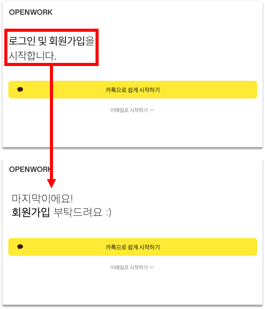 오픈워크는 5번째 단계에서 로그인을 요청한다. 로그인은 서비스를 이용하기 위해서 반드시 필요한 과정이지만, 사실 제법 귀찮은 과정이다. 실제 로그인 과정에서 많은 유입자가 이탈된다. 이런 이탈률을 줄이기 위해, 브랜드나 제품을 어느 정도 둘러보게 한 후에 로그인을 요청하게 하면 상대적으로 많은 전환을 유도할 수 있다. 오픈워크는 '카카오톡'을 활용해 회원가입 과정을 쉽게 했다. 카카오톡 채널을 통해 가입 시 좋은 점은 2가지가 있다. 먼저, 회원 가입자의 수고를 많이 덜어낼 수 있다. 둘째, 카카오톡 알림톡과 연동해서 소비자와 커뮤니케이션 채널을 확보할 수 있다. 이 두 가지 장점을 바탕으로 오픈워크는 카카오톡 채널로 가입하기를 유도한다. 다만 조금 아쉬웠던 부분은 상단 메인카피 부분이다. '로그인 및 회원가입을 시작합니다.'는 카피가 조금 딱딱하게 느껴졌다. 앞에서는 "써봐야 아니까"와 같이 친근한 말투로 다가왔다가 갑자기 '~ 시작합니다.'는 멘트는 조금 낯설게 느껴지는 부분이었다. 그래서 딱딱한 느낌을 줄이고, 명확하게 전달하기 위해 '마지막이에요! 회원가입 부탁드려요 :)'라고 바꿔봤다.