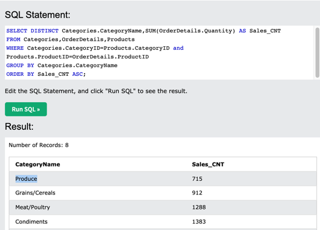 WHERE Categories.CategoryID=Products.CategoryID and Products.ProductID=OrderDetails.ProductID