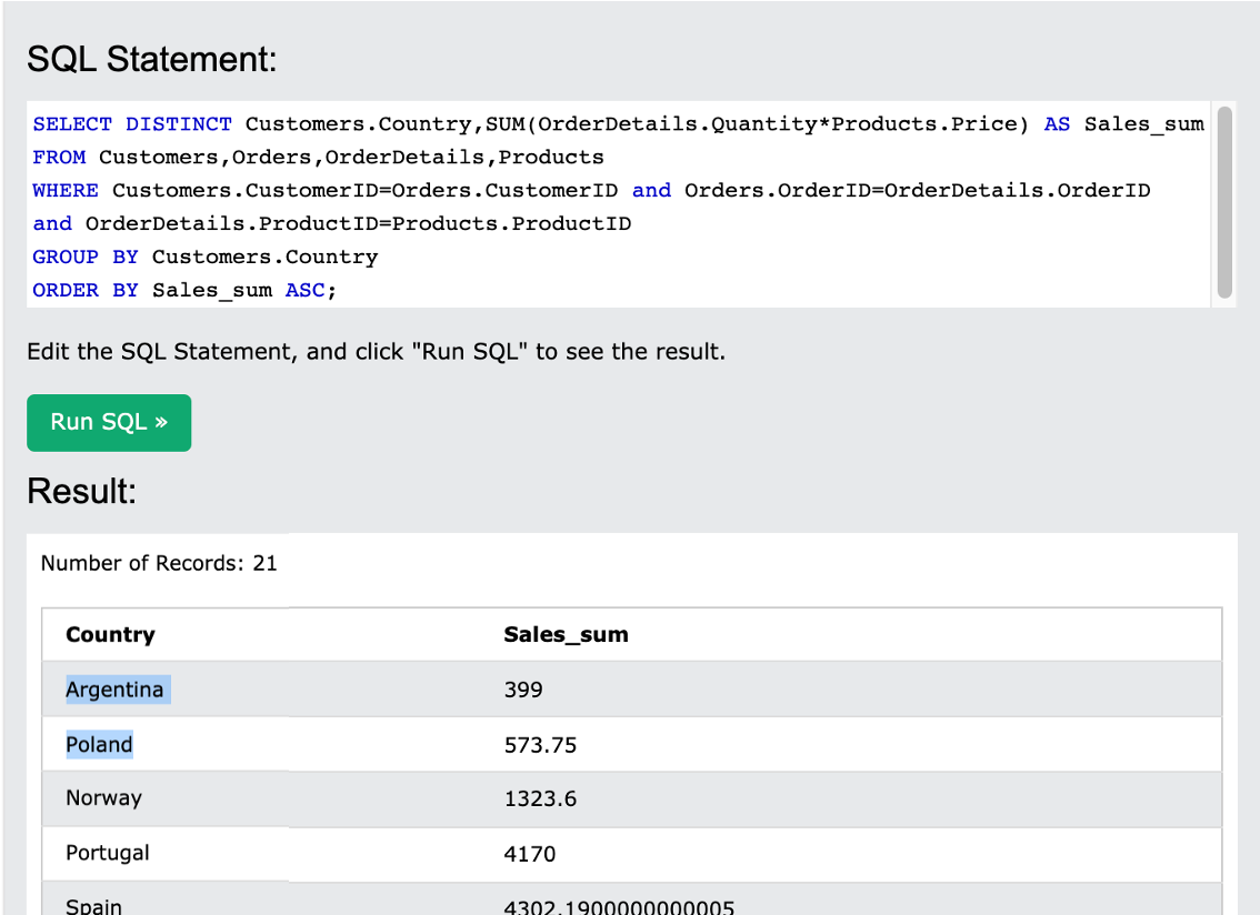 SELECT DISTINCT Customers.Country,SUM(OrderDetails.Quantity*Products.Price) AS Sales_sum