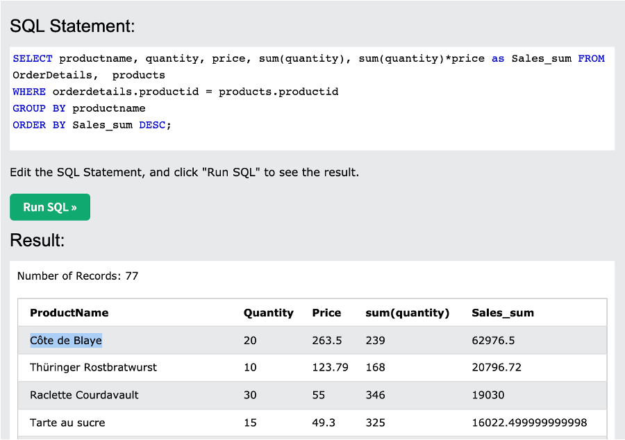 SELECT productname, quantity, price, sum(quantity), sum(quantity)*price as Sales_sum