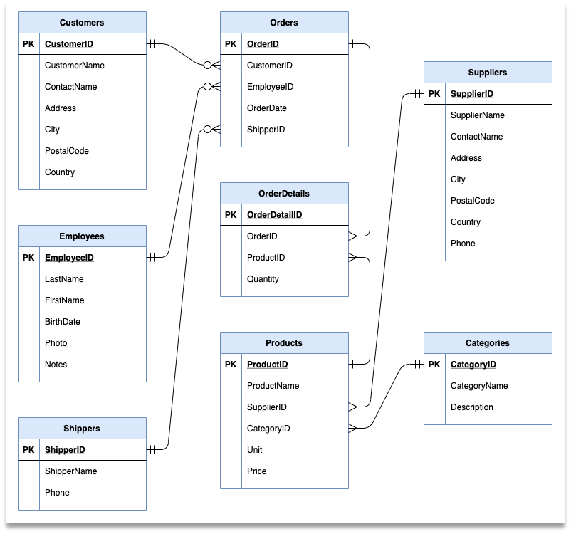 WHERE Customers.CustomerID=Orders.CustomerID and Orders.OrderID=OrderDetails.OrderID