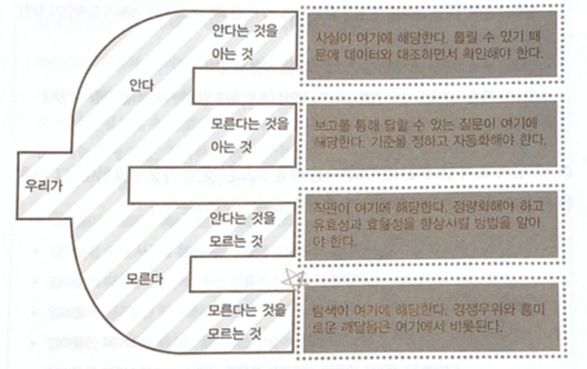 위 그림에서 스타트업과 가장 밀접한 것은 '모른다는 것을 모르는 것'이다. 즉, 시장을 뒤흔들 새로운 뭔가를 발견하기 위해 탐색하는 것이다. 탐색은 스티브 블랭크가 스타트업이 해야 할 일이라고 말한 것, 즉 확장할 수 있고 반복할 수 있는 사업 모델을 찾는 일과 부합한다.