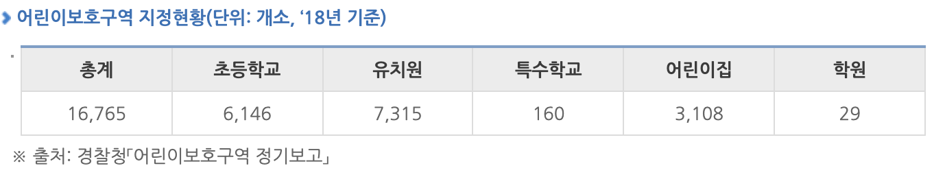 도로교통공단 홈페이지에서 참고한 어린이 보호구역 지정현황을 보면 전국에 약 17000개의 어린이 보호구역이 지정되어 있다. 2018년 기준이라 현재는 더욱 늘어났을 것으로 예상된다. 따라서, 어린이 교통사고를 방지하기 위해서는 스쿨존 내 어린이 교통사고의 특성은 무엇이 있는지 확인하고, 발생할 수 있는 문제점을 해결해야 한다.