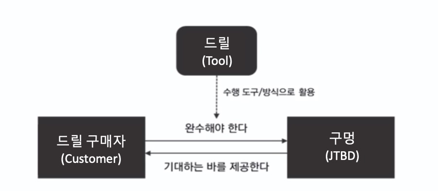 즉, 드릴(drill) 구매를 희망하는 고객은 구멍을 뚫는 과업을 해결하기 위해 드릴을 Tool로써 고용한다는 것이다. 따라서, JTBD에서는 ‘왜(why)’를 파악하는것이 중요하다. 이는 사용자의 Situation(상황), Motivation(동기), Expected Outcome(기대값)을 기반에 두고 파악한다.